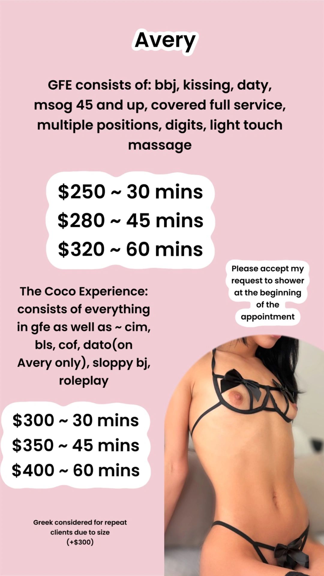 Hi my name is Avery I am new to the industry and can’t wait to get started. I love to please and I am a fantastic conversationalist I am out-going love to travel, do art and please those who are in my company