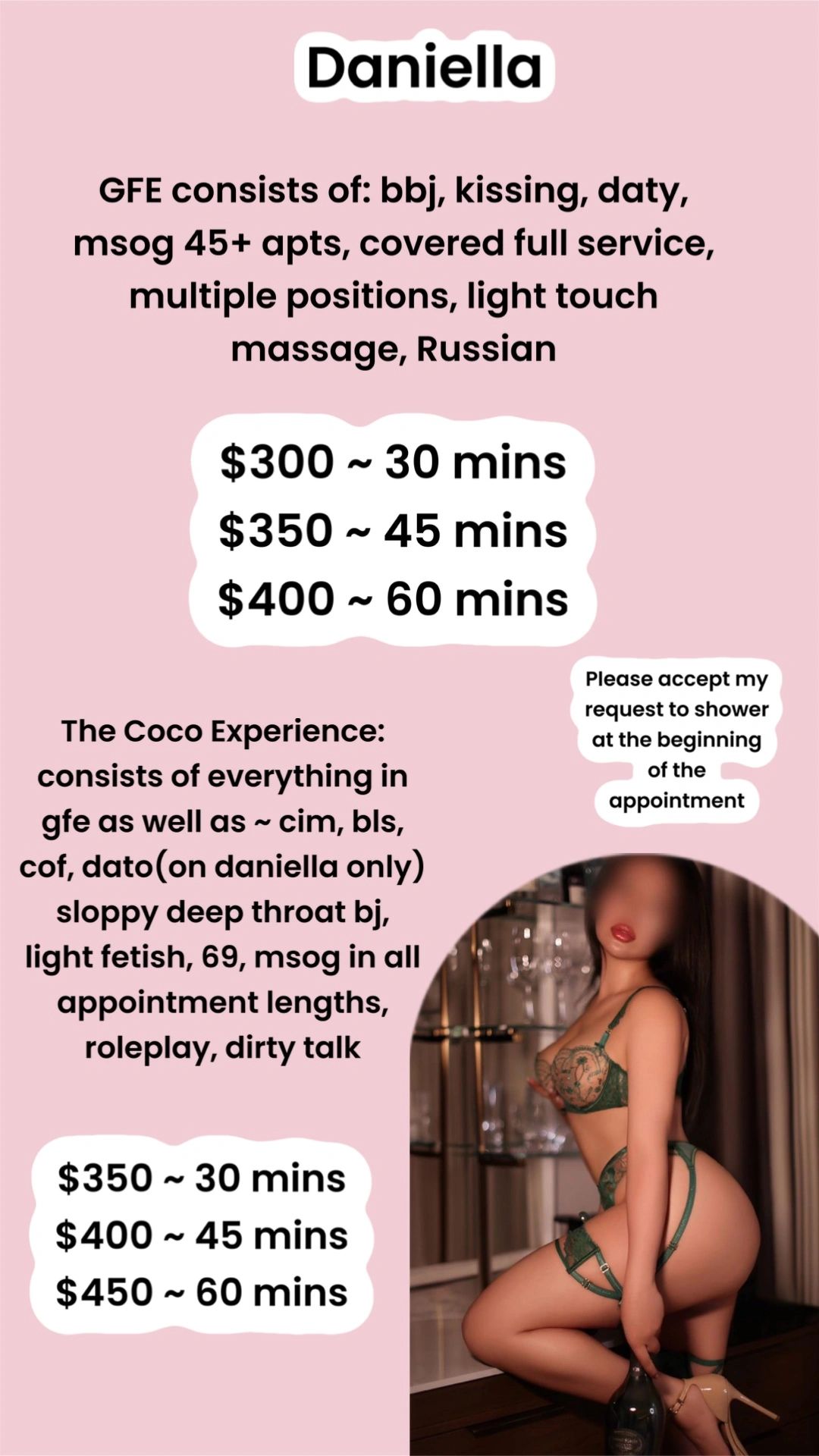 Every moment with Daniella is an experience, a curated masterpiece of intimacy, charm, and adventure. She embodies the perfect GFE: warm, playful, and deeply engaging with a PSE twist that adds a tantalizing spice to her allure. Her long, cascading brown hair frames those deep, soulful brown eyes that seem to hold secrets you’d spend a lifetime unraveling. Her soft skin begs to be touched, a canvas of warmth and tenderness, while her pink french tip manicure hints at a playful, feminine elegance. And her curves? They’re poetry in motion, every movement a hypnotic dance leaving you breathless.